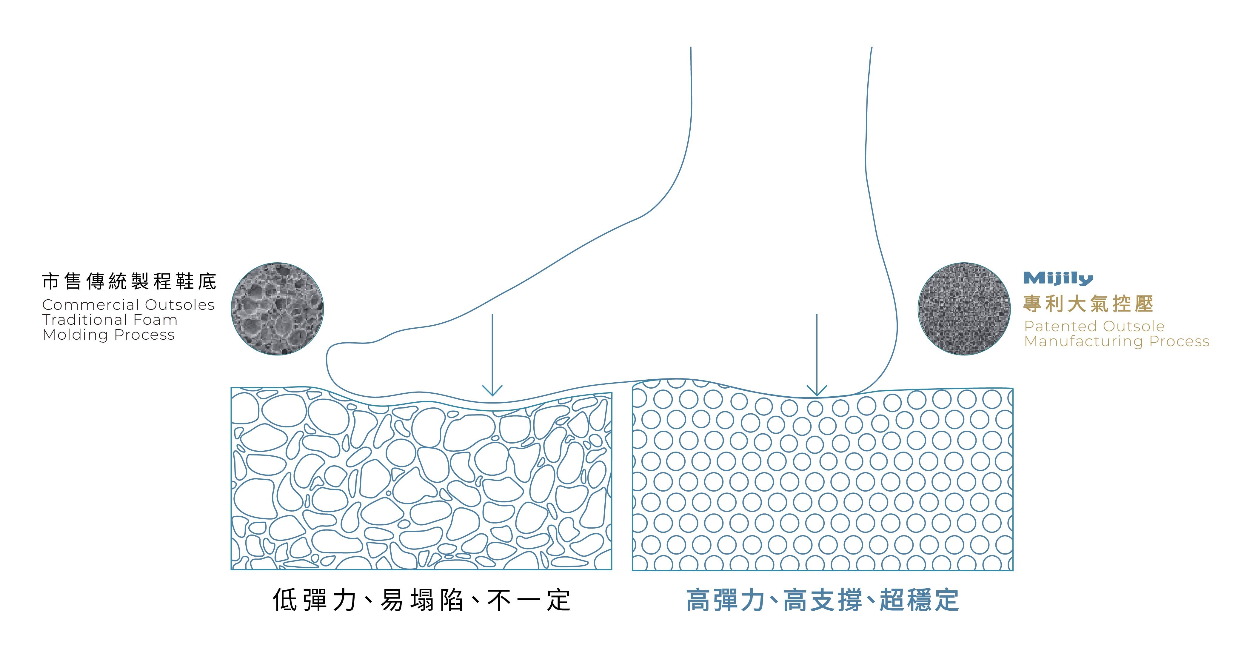 透過特殊壓力控制技術,讓鞋底在踩踏時產生柔韌的支撐與回彈。帶來別於傳統製程的舒適腳感,讓每一步更加輕鬆自在。