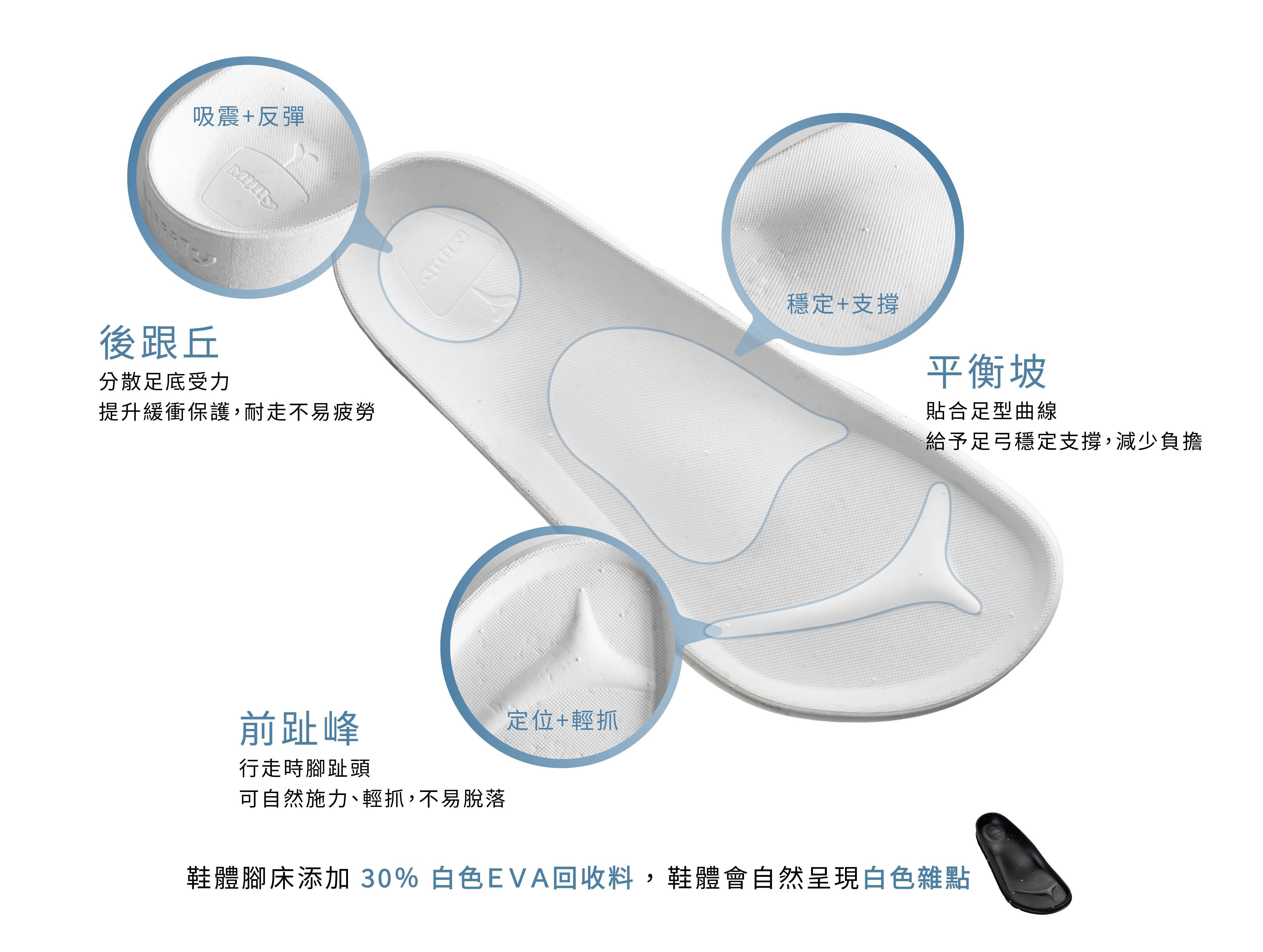 搭配人體工學設計,打造腳床角度完整服貼的【 足下山景 】,使鞋底擁有高強度支撐同時又輕盈柔韌,給予全方位呵護。