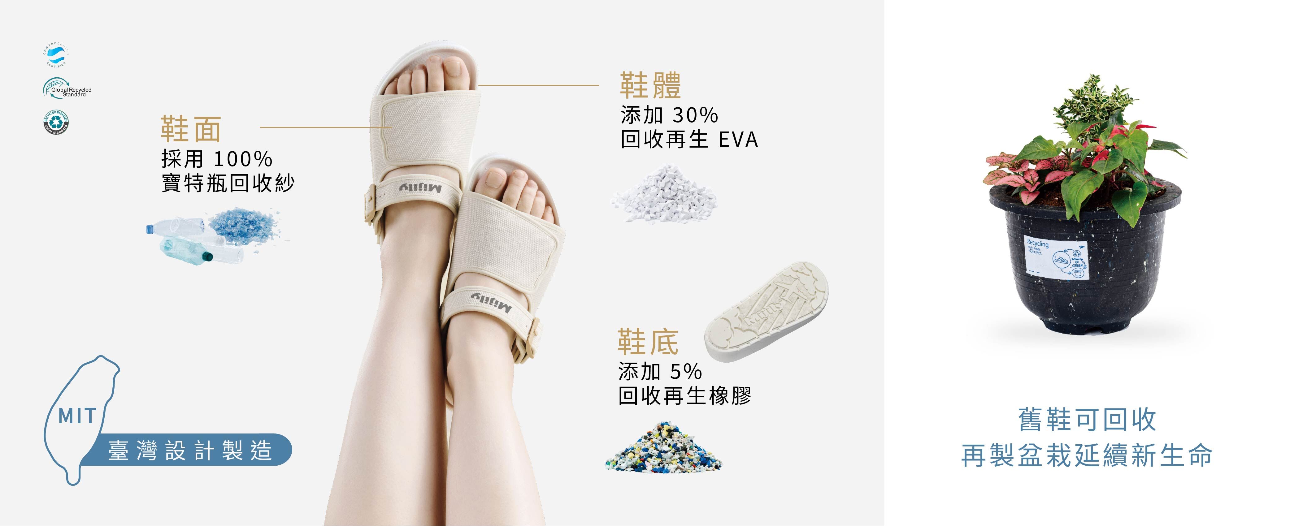 設計之初就採用大量再生材料製作,讓鞋履在完成穿著旅程後,仍能被回收再製。