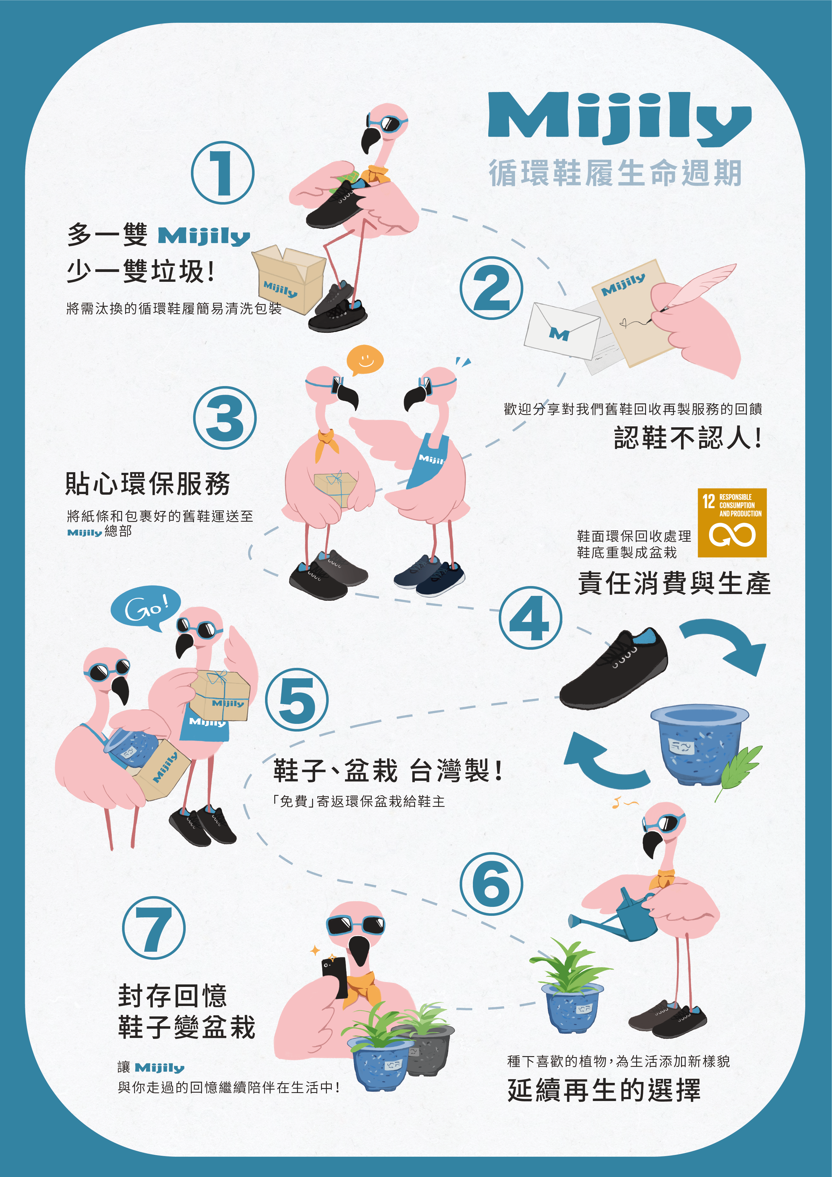 Mijily 期望以實際循環再生的行動與規劃來減輕鞋子在汰換過程中對環境造成的傷害,不因焚燒產生空汙、不因棄置而遍布海岸,在貼近生活與友善循環中達到好的平衡。