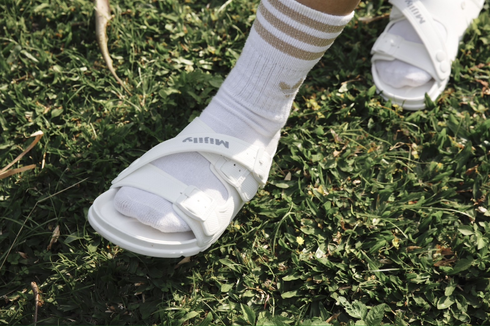 ▲ 懶人拖穿法可將雙腳後跟條帶對調互換,Mijily Logo 就能反過來變成正面囉!