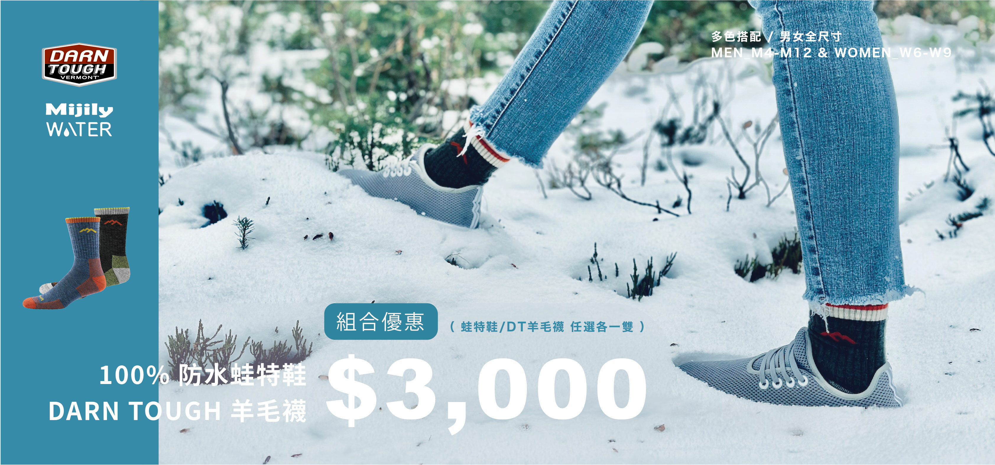 穿上 Mijily 防水蛙特鞋,搭配 Darn Tough 的舒適保暖襪款,讓每一步都是輕盈的冒險!冬季旅程更輕鬆自在。