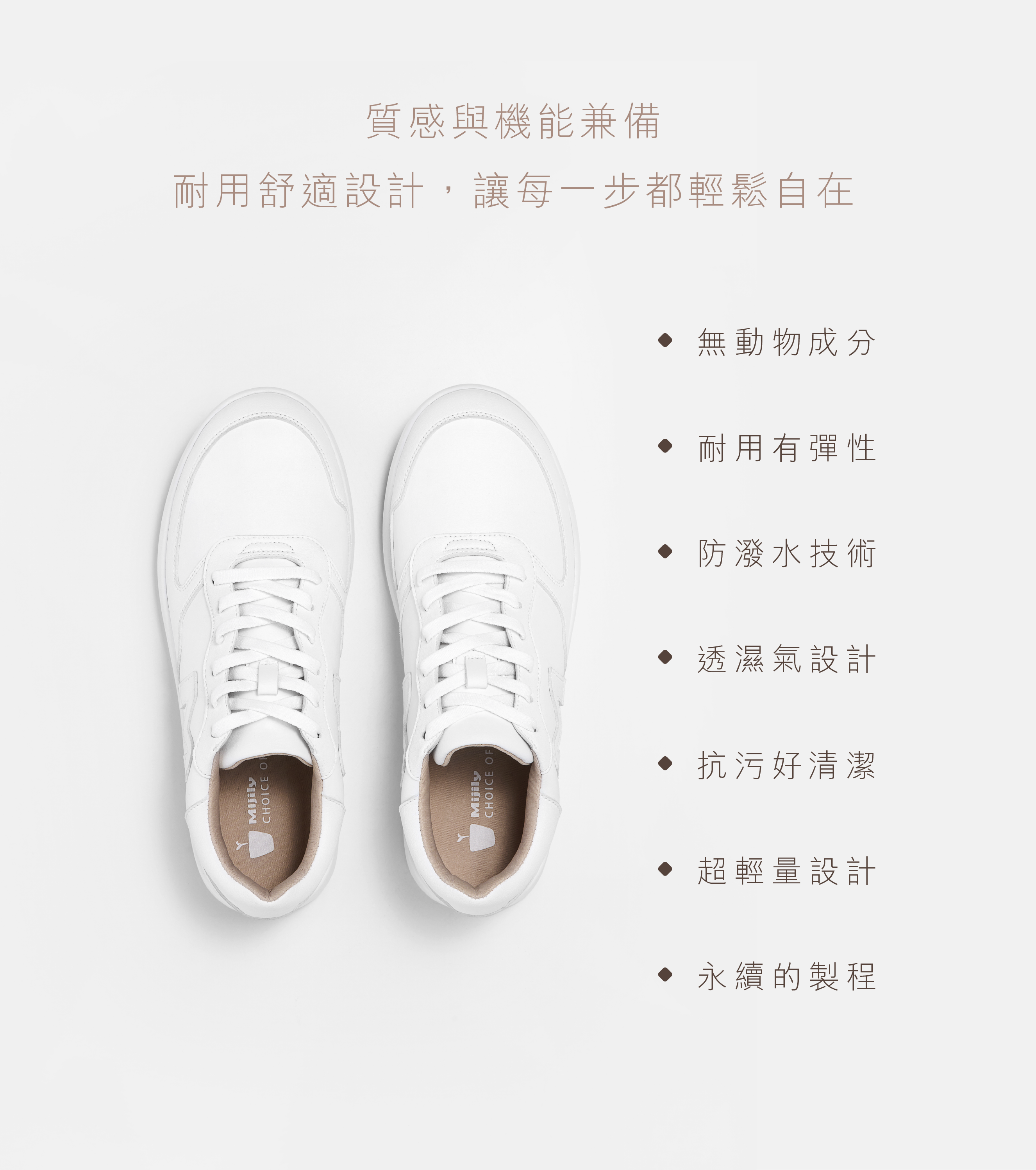 Mijily Light 經典小白鞋「靈感來自旅途中迷人的風景和閃亮的足跡 ✨ 純白細緻的純素皮革,溫潤中帶有微霧光澤,持續陪你走遍生活中的美好~